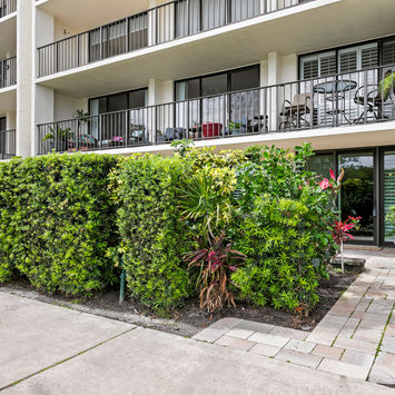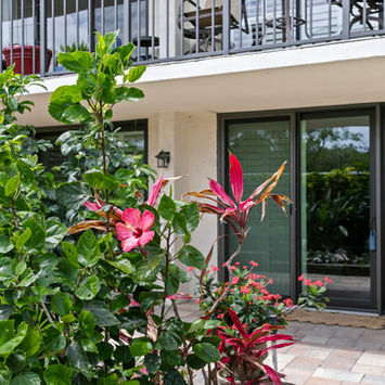 A formal double-door entry from the secured interior hallway introduces the home. Just beyond, a different kind of arrival unfolds through expansive sliding glass doors that open directly to an oversized paverstone patio. Framed by lush, wraparound garden beds, this outdoor space is both inviting and unusually flexible. It carries the rare advantage of owner-controlled planting, an uncommon feature that allows for personalization, privacy, and provides a true extension of the home.