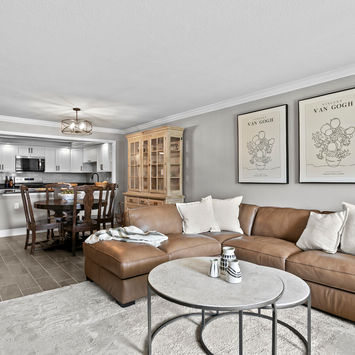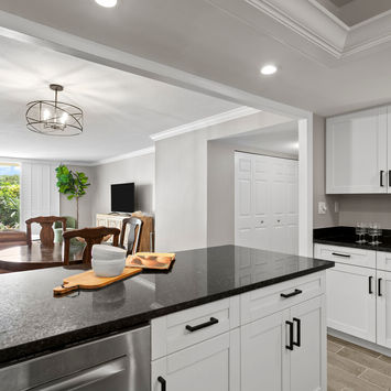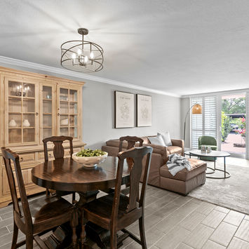 Inside, wood-look porcelain tile flooring runs throughout, designed for durability and continuity with the indoor-outdoor flow. The living room connects naturally to a defined dining space, where an ironwork chandelier adds a focal point anchoring this space, and onward to a thoughtfully updated kitchen. White shaker cabinetry, black granite countertops, and stainless steel appliances, including a gas range, are complemented by a peninsula with bar seating, a pantry, and a dedicated coffee bar. A tray ceiling adds architectural dimension.