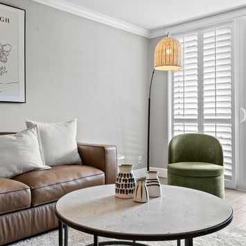 The primary suite offers a comfortable and private retreat, with floor-to-ceiling sliding glass doors that open directly to the patio, complemented by plantation shutters for light control and privacy. The ensuite bath has been tastefully updated with a wide vanity finished in black granite, generous drawer and cabinet storage, and a clean, timeless aesthetic. A shower over tub combination completes the space with both function and flexibility.